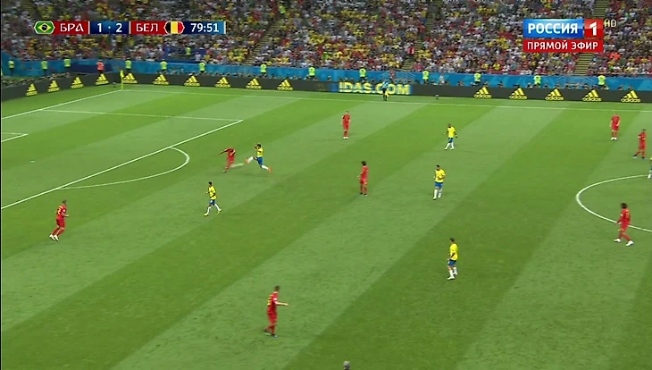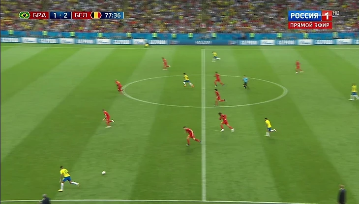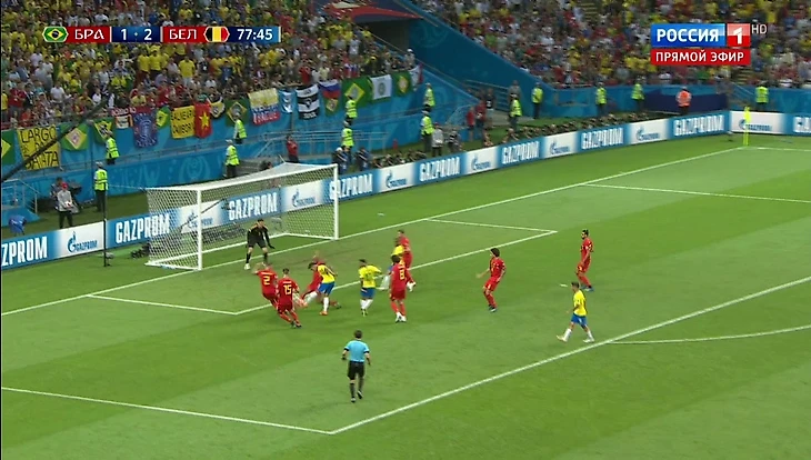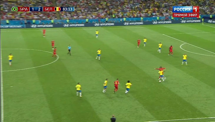 Для развлечения можете подсчитать количество бельгийцев и количество бразильцев. Неслучайно, что добивание Неймара придётся в одного из игроков в красной форме.