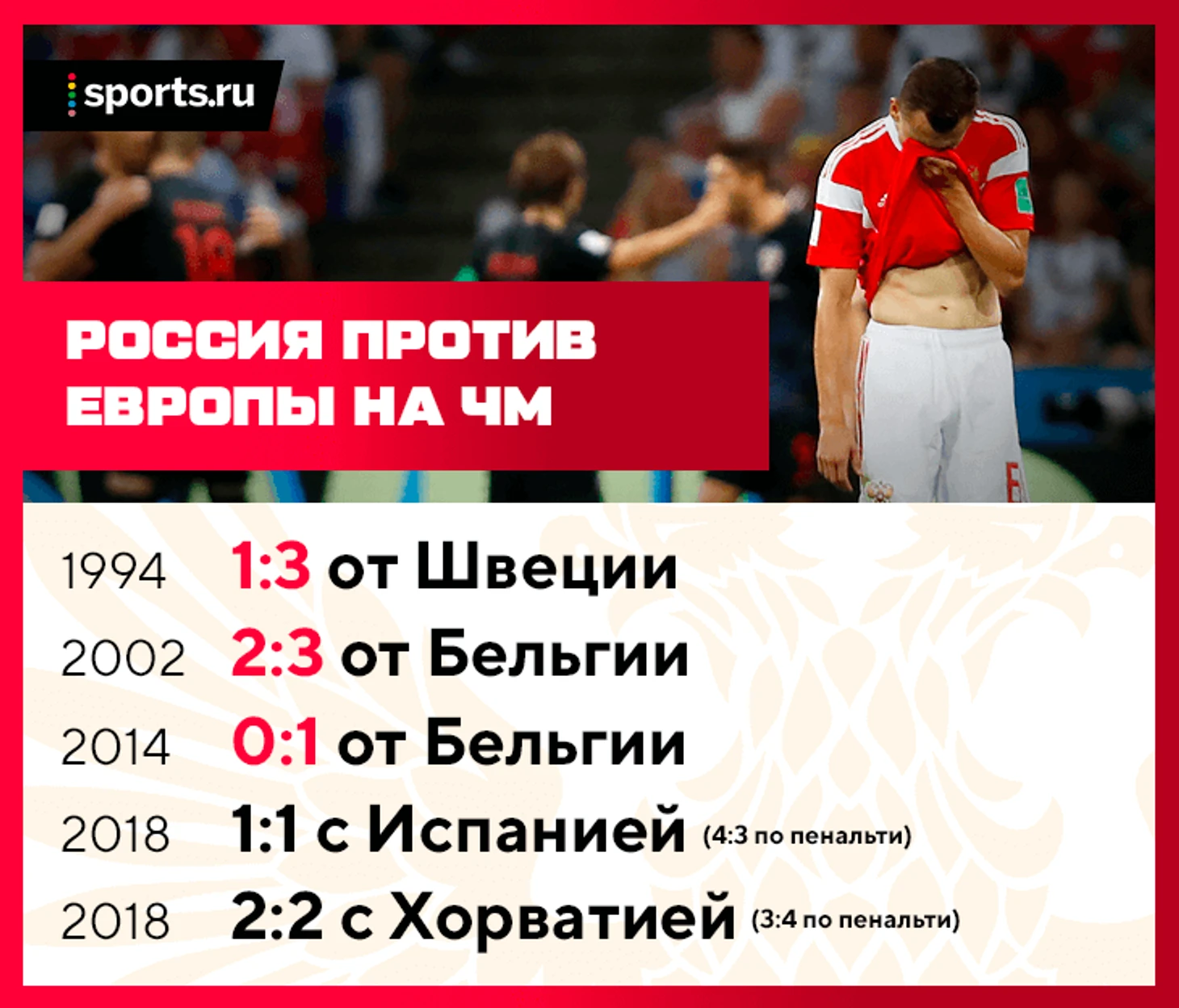 • Россия ни разу не обыгрывала европейские команды на ЧМ. В игре с испанцами на предыдущей стадии была ничья в основное время; кроме них, наша сборная играла со шведами (1:3) и бельгийцами (2:3 и 0:1).