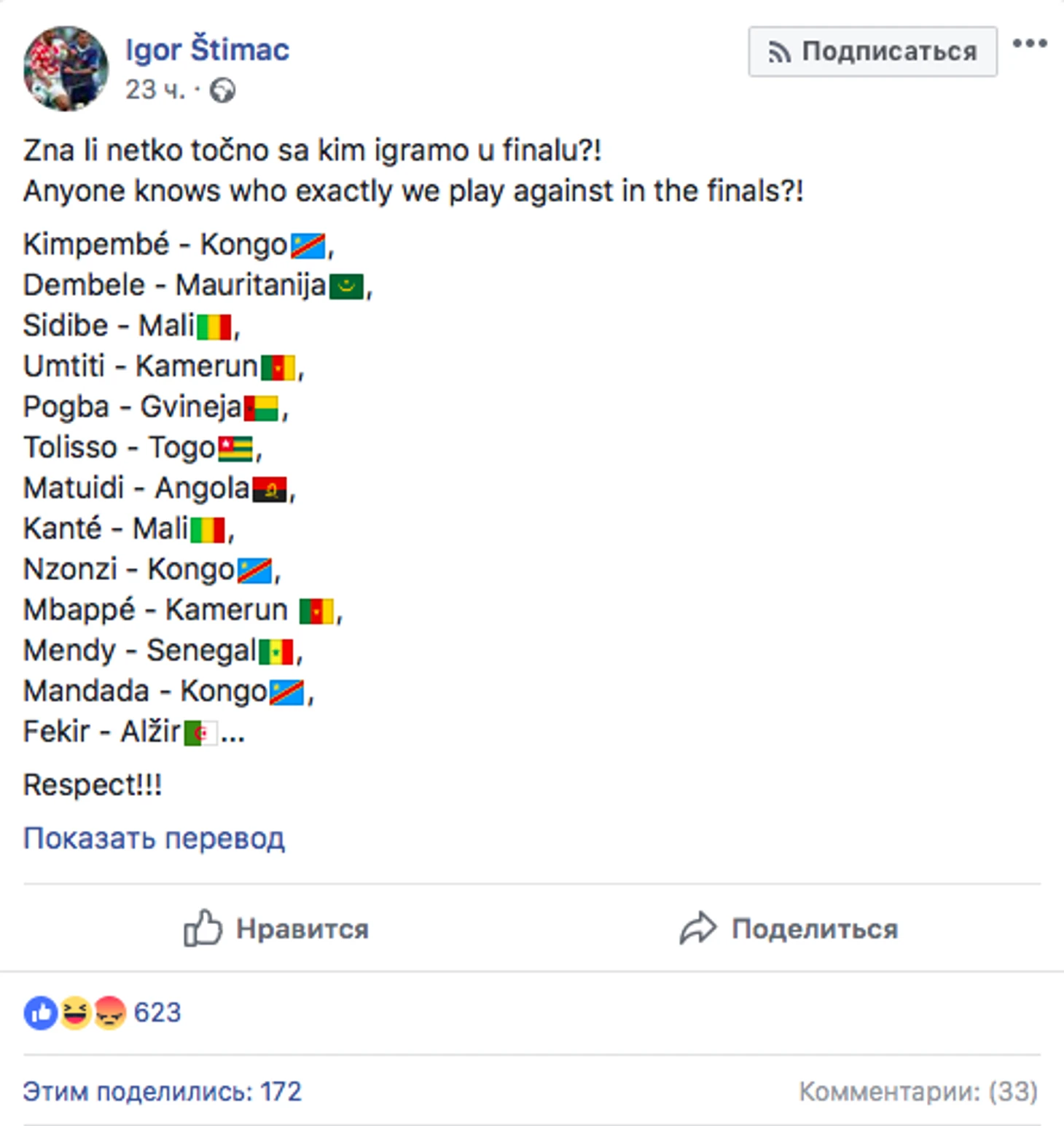 Бывший главный тренер Хорватии сборной Игор Штимац прошелся по составу сборной Франции на ЧМ и написал в фэйсбуке очень странный пост с подписью: «Кто-нибудь знает точно, с кем мы играем в финале?»