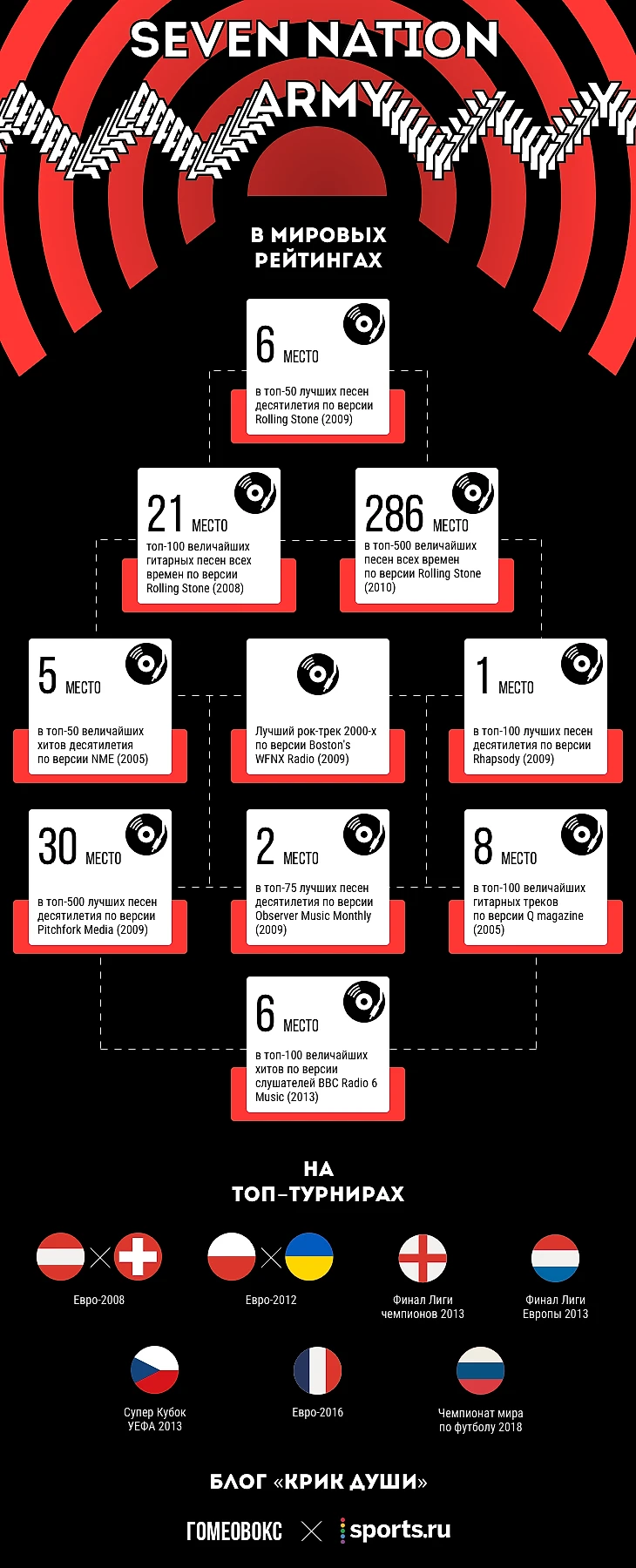 После такого ни у кого не было шанса: оставалось только признать величие этой песни и использовать ее абсолютно везде. Именно так Seven Nation Army появилась на Евро-2008, ЧМ-2010, Евро-2012, матчах НБА, НФЛ, МЛБ и далее по списку.