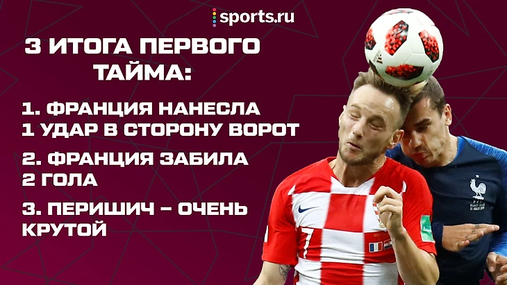 18:19 Франция уже забила! Автогол Манджукича! Гризманн навесил на Погба, который мог быть и в офсайде, но Манджукич выиграл верх и по привычке сбросил мяч в девятку! 1:0!