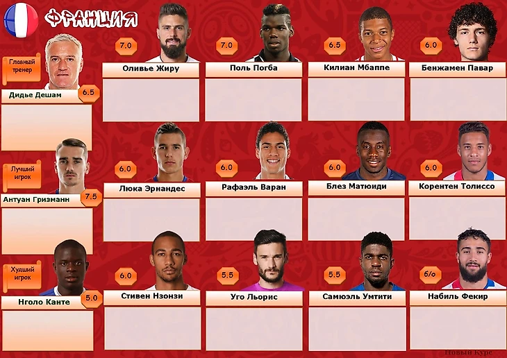 Франция (4-2-3-1): Льорис – Павар, Варан, Умтити, Л.Эрнандес – Погба, Канте (Нзонзи,55) – Мбаппе, Гризманн, Матюиди (Толиссо,73) – Жиру (Фекир,81)