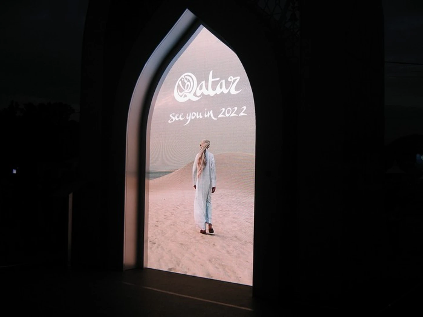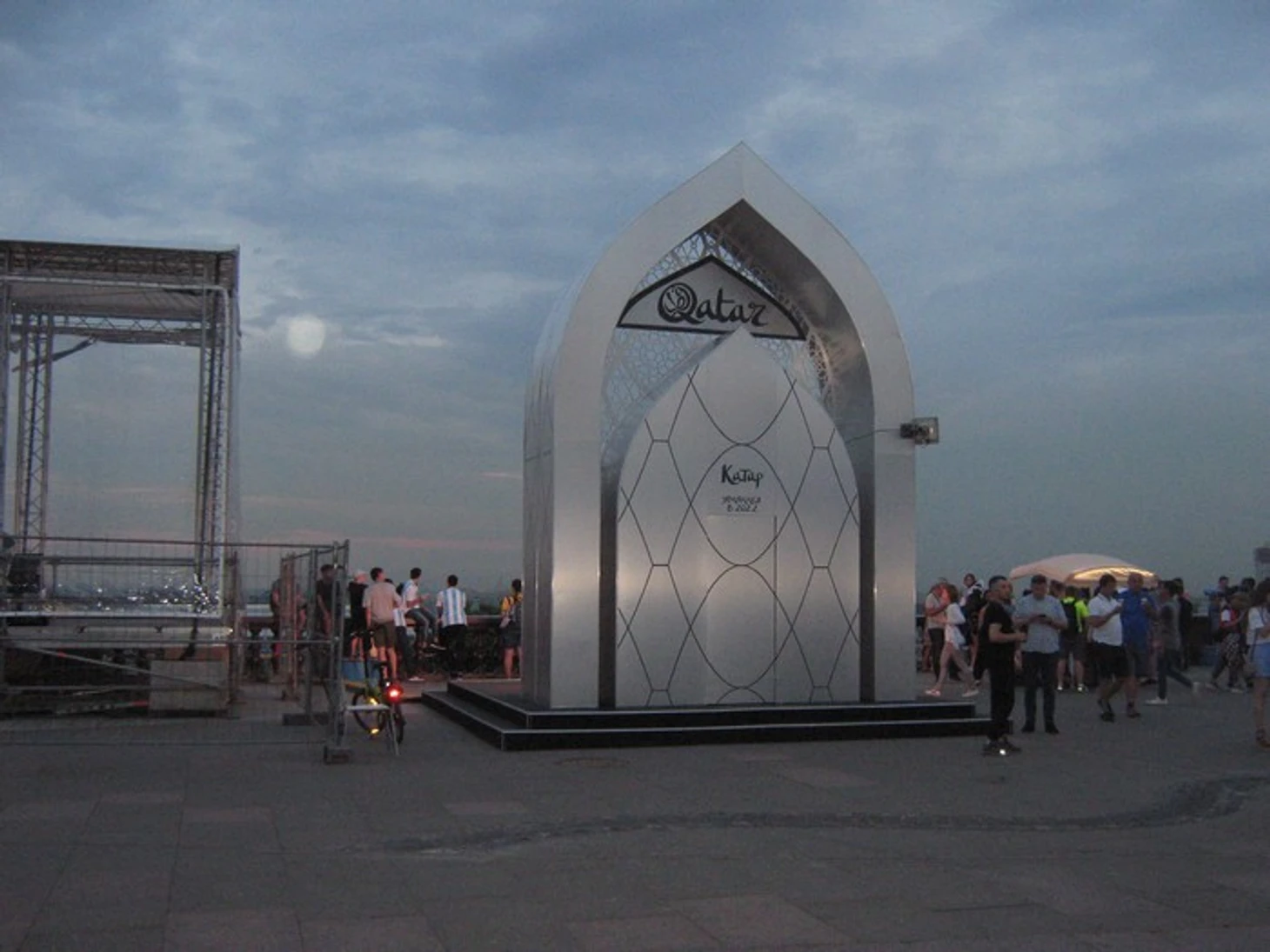 Понятно, думаю, будет мероприятие, посвящённое грядущему через четыре года чемпионату мира в Катаре с передачей от нашей страны эстафеты и т.п. Но через некоторое время «теремок» ожил и вместо фотки там появились либо мимо идущие, либо глазящие на тебя люди. Эффект был настолько неожиданным, что не все сразу поняли, что происходит.