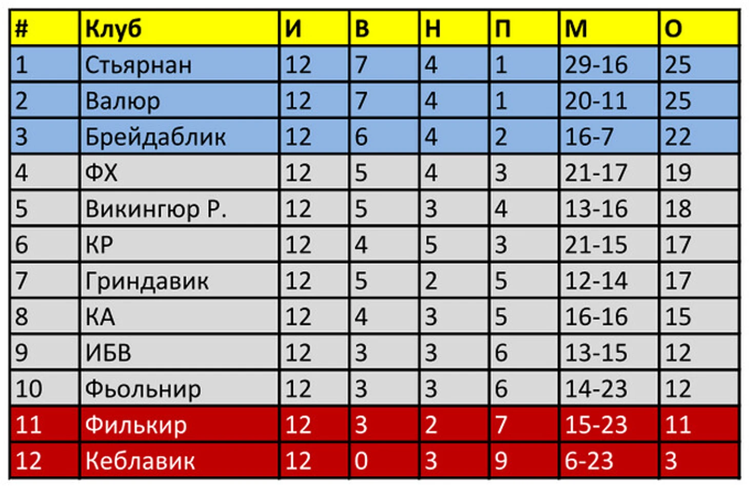 Голы: Джонатан Рикардо Гленн [55'], Эмиль Аусмюндссон [81'] - Давид Эдн Атласон [5'], Бьядни Паудль Л. Руноульфссон [7'], Николай Андреас Хансен [41']