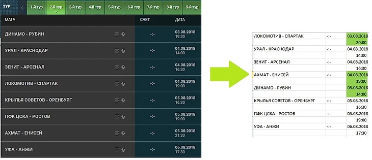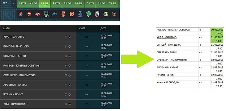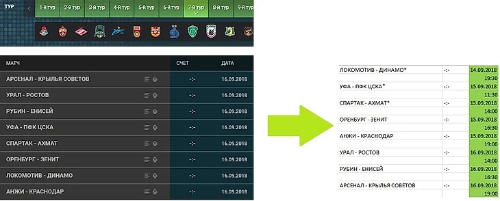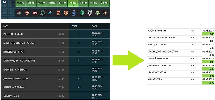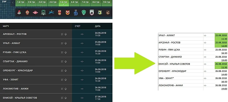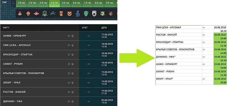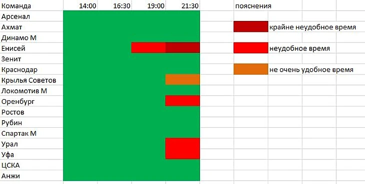 Естественно, нужно учитывать множество других факторов: жару в летние месяцы, согласование проведения игры с полицией и даже курортный сезон (выезд в Краснодар летом - повод для болельщиков посетить черноморское побережье). Попробуем проанализировать расписание первых семи туров, опубликованное РФПЛ, и отредактировать его согласно приведенным критериям: