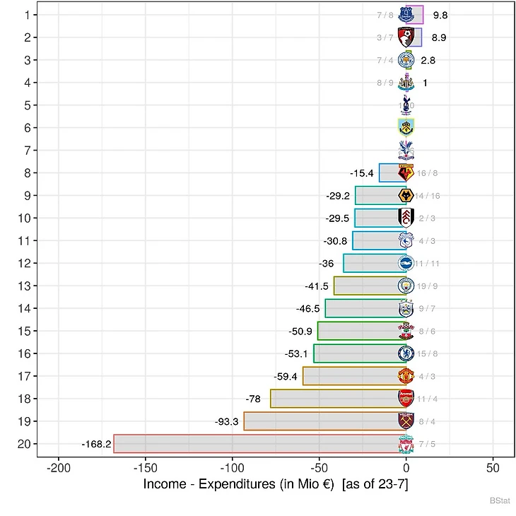 Трансферный баланс клубов АПЛ на сегодняшний день