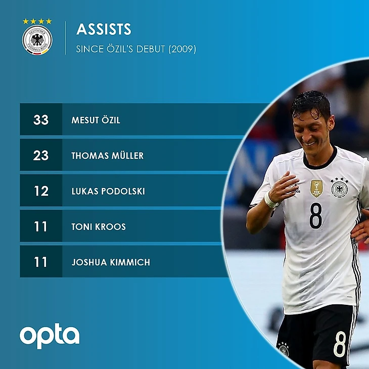 С момента своего дебюта в 2009-м, Озил отдал 33 ассиста в футболке сборной Германии (на 10 больше, чем у второго ассистента за этот период)