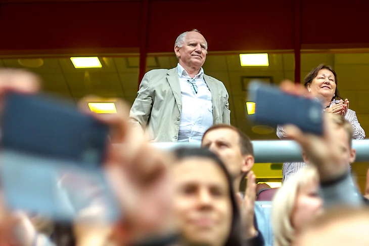 Секторы по центру заполнили за полчаса до начала. Подошедшим позже пришлось занимать дальние места, откуда было мало что видно из-за огромных колонок. Ну, хотя бы слышно. Спасала трансляция на табло. Заядлый болельщик, актер театра и кино Валерий Баринов, тоже не пропустил вручение золотых медалей.