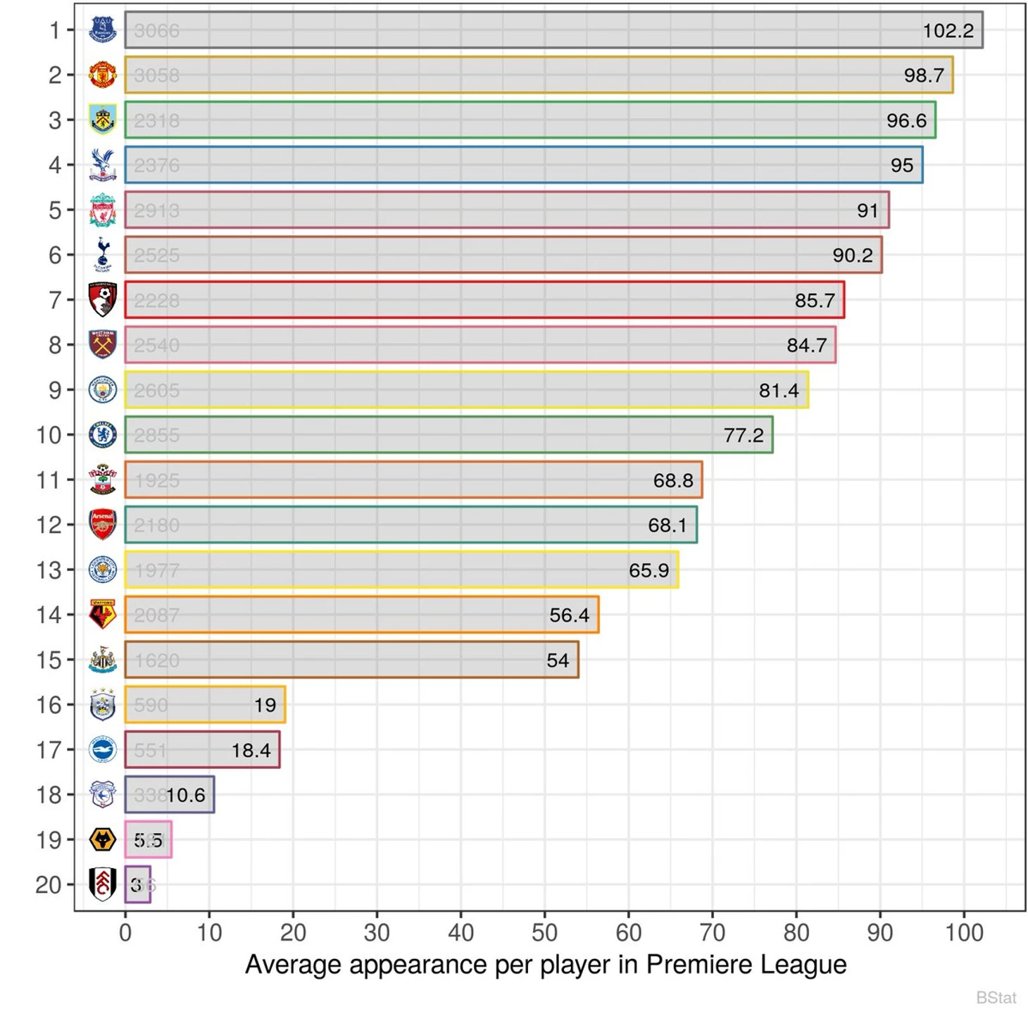 Если рассматривать среднее количество сыгранных матчей (в АПЛ) игроками команд английской Премьер-лиги, то на первом месте обосновались парни из "Эвертона" (102,2 сыгранных матча в среднем).