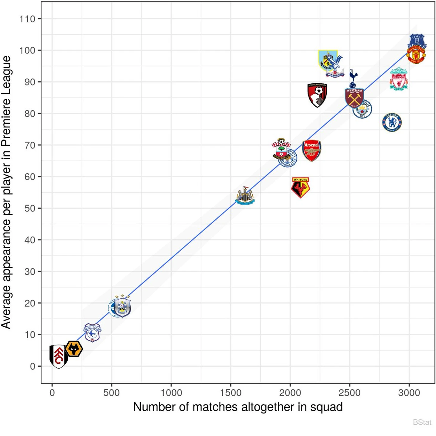 А здесь продемонстрировано соотношение среднего количества сыгранных представителями команд матчей в АПЛ и общего количества таких поединков у игроков команд.