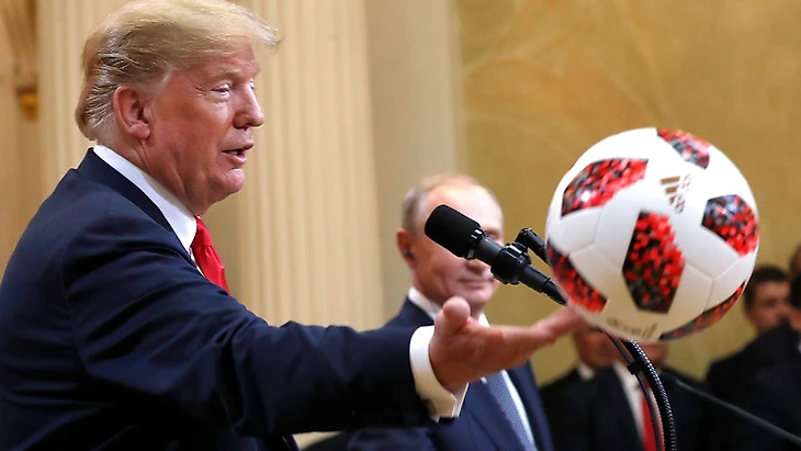 «Теперь мяч на вашей стороне», – пошутил Владимир Путин, передавая Дональду Трампу футбольный мяч чемпионата мира 2018 г. во время их встречи в Хельсинки. Взяв мяч, президент США перекинул его жене и сказал, что передаст мяч своему 12-летнему сыну Бэррону.