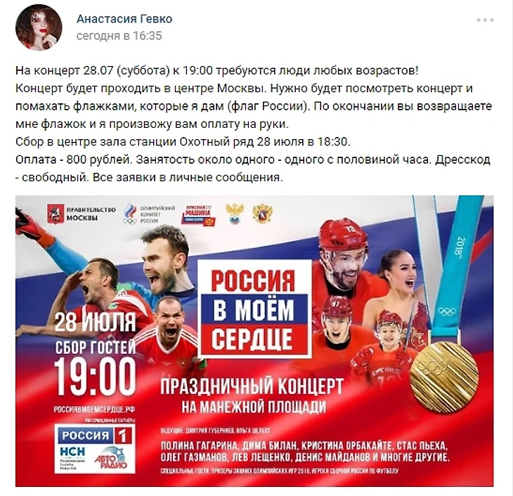 800 рублей, посуда и комплект постельного белья. Именно так собирают зрителей на концерт во славу российского спорта