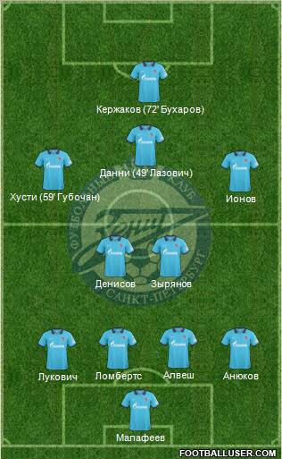 "Зенит": 16. Малафеев. 2. Анюков. 6. Ломбертс. 3. Алвеш. 24. Лукович. 27. Денисов. 18. Зырянов. 10. Данни (8. Лазович, 49). 23. Хусти (14. Хубочан, 59). 57. Ионов. 11. Кержаков (9. Бухаров, 72).