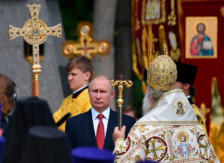 Сначала Путин побывал на литургии на Соборной площади, потом прошел в первых рядах крестного хода, а под конец послушал молебен около памятника князю Владимиру. Там патриарх Кирилл рассуждал о влиянии религии на ход истории и – в завершение речи – напомнил о Путине.