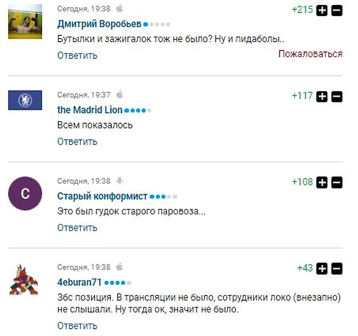 Я не понимаю. Я посещал уже, наверное, таких 3 матча, где после игры говорили, что были уханья. Но, блин, никогда такого не было. Я слышал скорее, что-то похожее на «Фуу» и это нормально, пусть и к моему сожалению, но это нормально. Болельщики часто «фукают» в сторону игроков соперника и судей. Фуу слышится, может, как «Ух»?