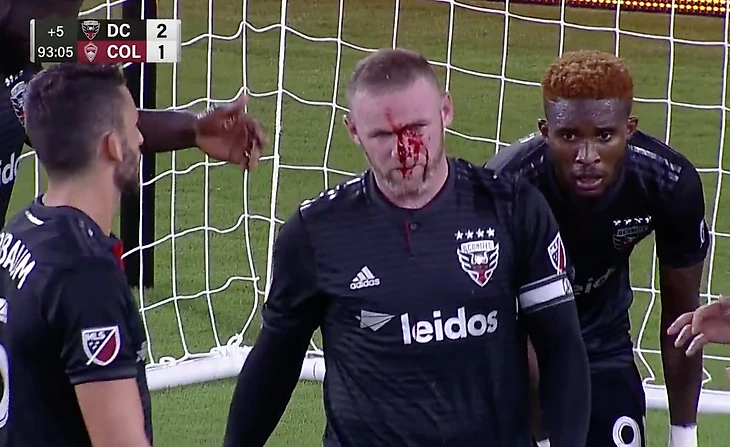 Один из игроков соперника хотел ударить по мячу головой, но не попал и налетел на одноклубника, которого опекал Руни. Итог – лицо англичанина в крови.