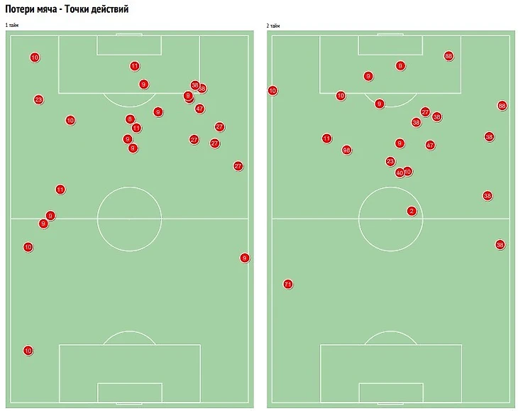 Карта потерь «Спартака». Большинство комбинаций в чужой трети прекращались на Зе Луише (№9)