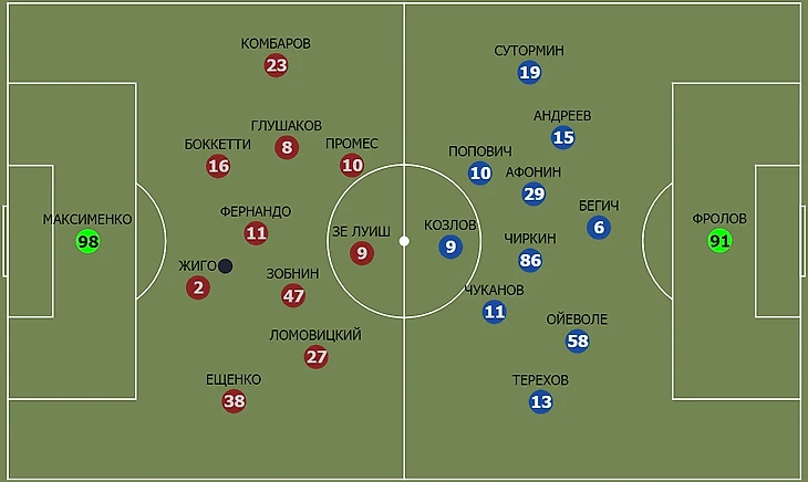 В целом Денис и в других эпизодах очень качественно определял для себя игровое пространство. До перерыва интересной была задумка с обменом позиций между ним и Промесом. Голландец мог сдваивать центр нападения с Зе Луишем, и в таком случае Глушаков понимал необходимость занять пространство в широкой зоне, выступая едва ли не в роли левого хавбека.