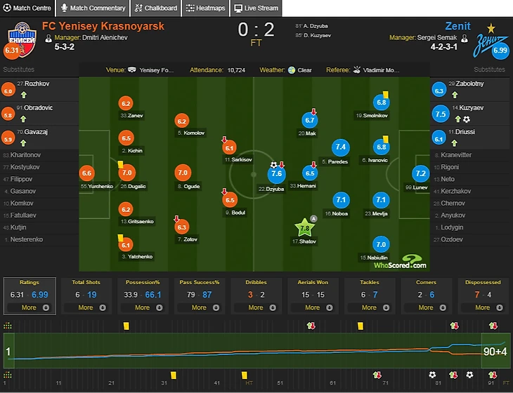 А вот так выглядит итоговая статистика от портала whoscored. Игрок матча-Шатов. Хотя, Кузяев бы поспорил. Но, справедливости ради, Кузяев, отыграл только 20 минут, в отличии от Олега Шатова. Худший игрок-Мак. Но т.к. Роберт играл не на своей позиции, то лично мой кандидат-это Эрнани.