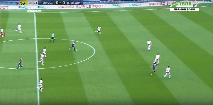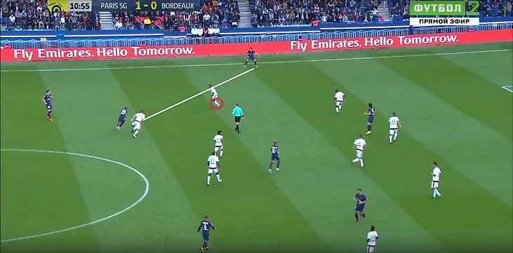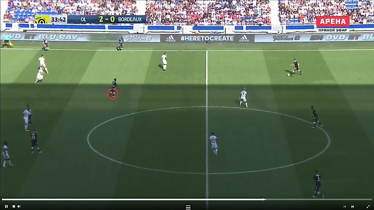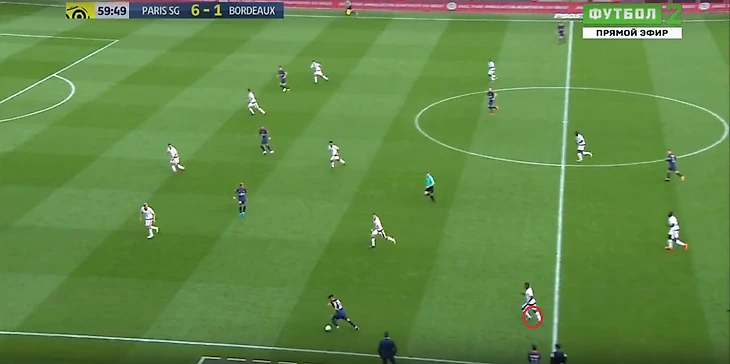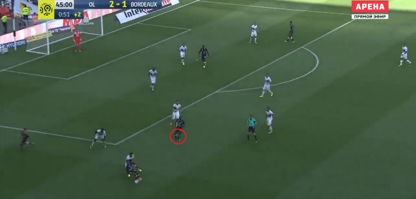 Все полузащитники «Бордо» бегут назад, Мальком просто показывает рукой кого надо закрыть и продолжает идти пешком.