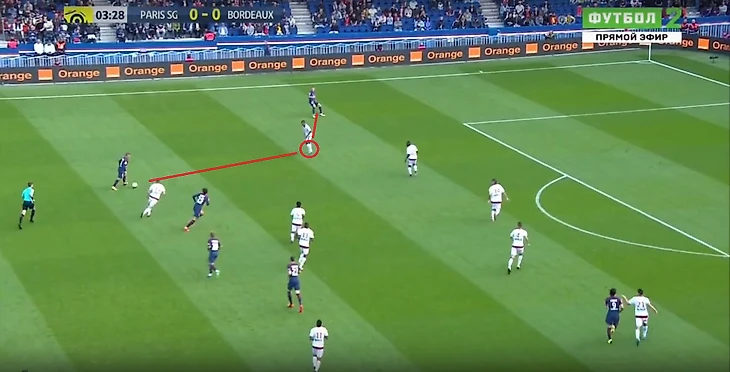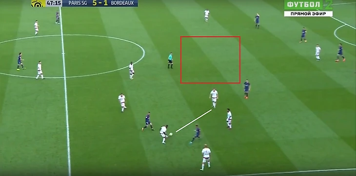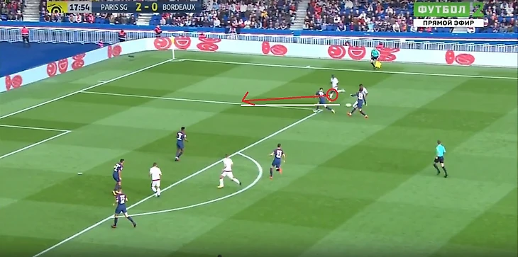 Контратака «ПСЖ». Неймар делает передачу на Мбаппе, открывшегося в свободной зоне.