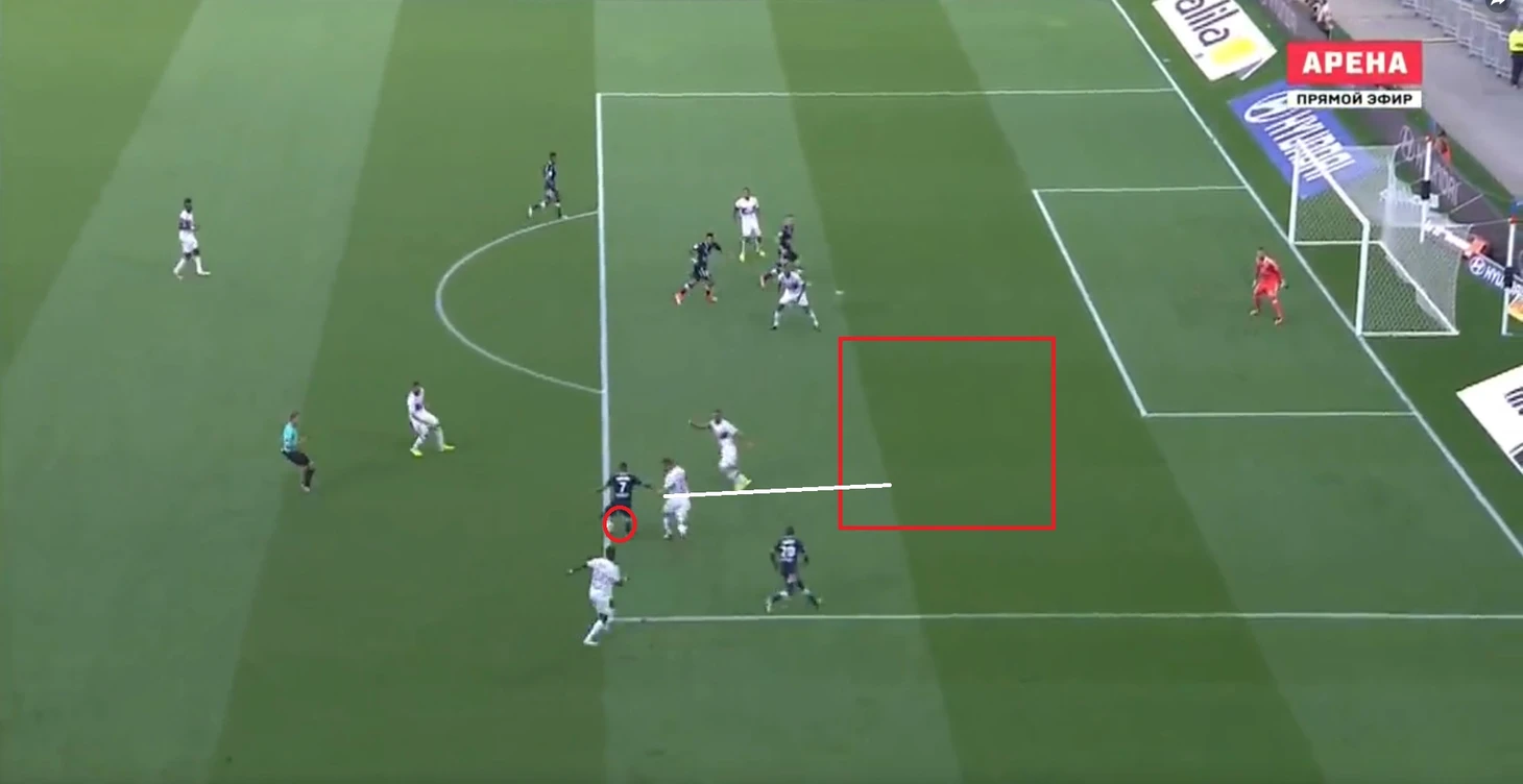 Мальком мог бы попытаться продолжить атаку по флангу, сыграв на Отавио, которому было бы удобно в касание продолжить атаку передачей на подключение фулбэку, но Мальком видит свободную зону в центре.