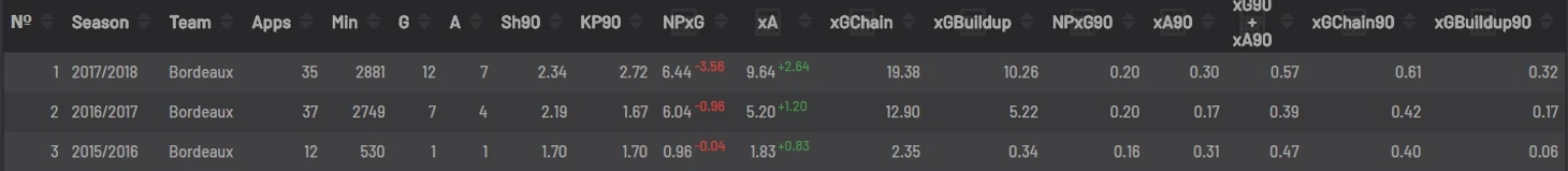 Несмотря на проблемы команды, Мальком провел хороший сезон. В «Бордо» он стал лучшим по всем атакующим показателям: xG, xA, key passes, xG buildUp (xG владений, в которые был вовлечен игрок, без учета атак, в которых он отдавал последний пас или бил по воротам) и xGchain (xG всех атак, завершившихся ударами, в которых поучаствовал игрок). Фактически вся атака жирондинцев (особенно до увольнения Гурвеннека) держалась на одном индивидуальном мастерстве Малькома. По ожидаемым голевым передачам с показателем 9.64 бразилец 5-й в лиге. По key passes – передачам под удар – Мальком с показателем 2.72 в своей команде, среди тех, кто играл регулярно, лидер с большим отрывом. Если не брать в расчет Кафу, который провел достаточно мало минут и выходил в основном на замену, то вторым после Малькома по этому показателю идет Франсуа Камано, с показателем 1.19, что еще раз показывает насколько бразилец был важен для атаки «Бордо» в прошедшем сезоне. Что еще важнее, Мальком после перехода во французский чемпионат, прогрессировал и улучшал свои числа с каждым сезоном.