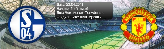 Итак, очень захватывающий матч. Путевка в финал Лиги Чемпионов. Обе команды будут очень мотивированны. А то, что первый матч «Шальке» играет дома, дает немцам небольшое преимущество. Противостояние Англии и Германии. Не думаю, что болельщики простят «Юнайтед» еще один вылет из самого престижного турнира Старого Света. А вот команда Ральфа Рангника уже нечего терять – команда прошла очень далеко и скорее всего будет продолжать играть в дерзкий футбол. Ну а что получится увидим 26 апреля в 22:45 по Москве.