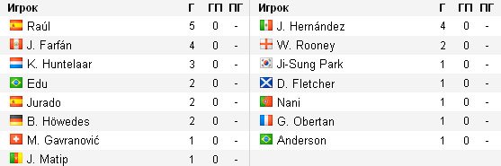 Стоит сказать, что команда не сильно блещет результативностью: только Рауль забил 17 мячей и Хунтелаар 10 (который, напомним, травмирован). Это достаточно низкий показатель. Для сравнения у Димитара Бербатова 22 мяча, у Эрнандеса 19, у Руни 13, у Нани 10 и только у Пака 7.