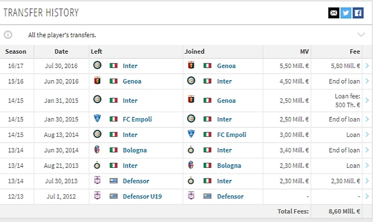В 2013 году, Диего Лаксальт переходит в Серию А, когда его в Интер перетащил Вальтер Мадзарри, но при этом не включил в заявку. С тех пор, прошло ровно 5 лет, аренды в Болонью, Эмполи и Дженоа. Парадокс, но за Интер Диего официальных матчей так и не провел. Прежде чем Дженоа подписала контракт с уругвайцем он провел в аренде у этого клуба 1.5 года. Полноценный трансфер игрока миланского Интера в Дженоа произошел в июле 2016 года и обошелся генуэзскому клубу в 5.8 млн евро. Тремя годами раньше нерадзурри отдали за уругвайца 2.3 млн евро.
