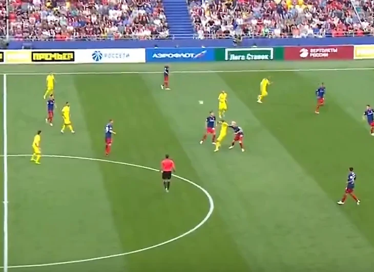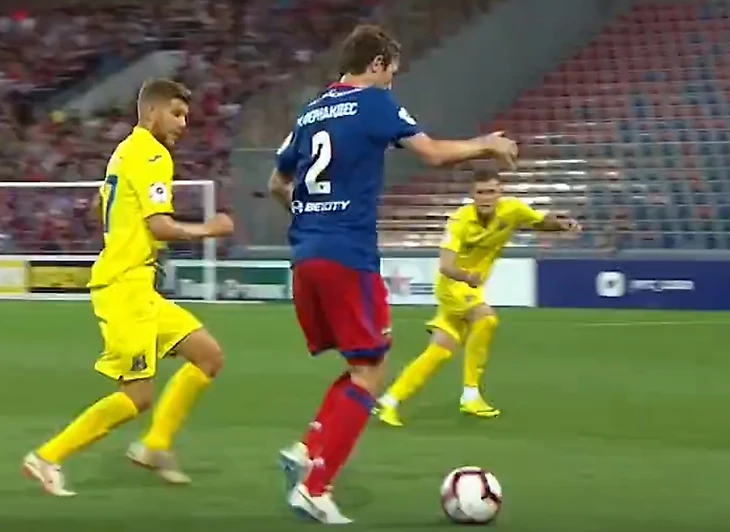 Первый скрин. Скопинцев побежал в контр-атаку, но она быстро оборвалась. Салетрос через мгновение выбьет мяч из-под Марио и прервет опасную атаку.