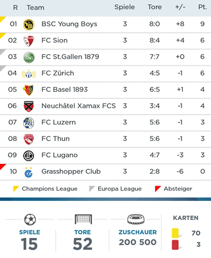 Неожиданно односторонняя игра получилась на «Стад де Сюисс». Перед этим туром в матче двух лидеров, выигравших свои первые две игры, ждали равной борьбы, а никак не выноса тела. Но в итоге «Цюрих» практически ничего не смог противопоставить «Янг Бойз», которым, кажется, даже сорокоградусная жара была нипочём. Уже к 15-й минуте хозяева заслуженно и уверенно вели 2:0. Сначала после по-настоящему чемпионской комбинации Оаро красивой передачей пяткой вывел Сулеймани один на один с Брехером, затем в обороне «Цюриха» образуется дыра, следует передача Сулеймани — и Фасснахт счёт удваивает. А под конец первого тайма снова Сулеймани разбирается у лицевой линии с Рюггом, навешивает на дальнюю штангу, где Оаро спокойно вносит мяч в ворота без всяких помех. «Цюрих» не показал никакой реакции: редкие атаки выглядели изначально вяло и безжизненно, и за весь матч команда Маньена не нанесла ни одного удара в створ. Единственный полумомент был в первом тайме у Винтера, но на пути удара оказался Мбабу. Во втором тайме «Цюрих» так и не проснулся, а «мальчикам» уже ничего особенно нужно не было. Только за пятнадцать минут до конца основного времени Фасснахт и Нзаме убежали в контратаку и установили окончательный счёт: 4:0.