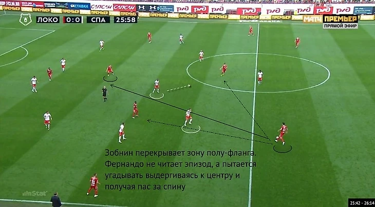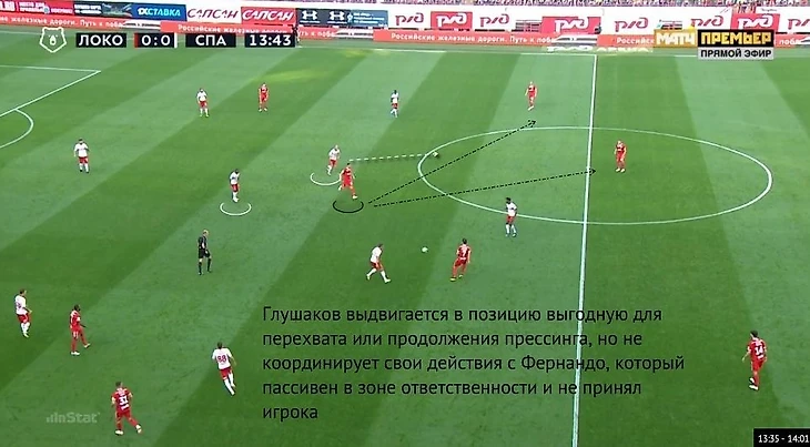 Эта отлаженность у «Спартака» просматривалась, однако выглядела шаблонной и в ситуациях, когда соперник принимал неожидаемое решение, это приводило к провалам команды в центре. Шаблонность просматривалась в действиях Фернандо и Глушакова в попытках занять позицию для перехвата мяча – они не читали ситуацию и не всегда ориентировались на партнера. Два примера: