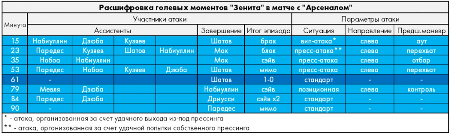 Игровая модель «Зенита» по сравнению с первым туром тоже не поменялась, но кое-какие элементы стали работать получше. В первую очередь, это касается качества прессинга/контрпрессинга и действий в ситуациях с переходом владения. В матче с «Енисеем» зенитовцы организовали только один острый момент непосредственно после отбора (трехходовка Кузяев-Шатов-Мак на 72 минуте), против «Арсенала» этот фокус приводил к созданию реальных угроз трижды.