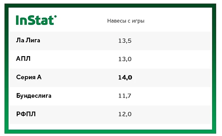 По количеству навесов в среднем за матч чемпионат России (в прошлом сезоне еще РФПЛ, а не РПЛ) замыкает рейтинг вместе с бундеслигой. Больше всего навешивают в Ла Лиге и серии А. Причем в Испании лидер чемпионата по навесам – это «Реал», а в Италии – «Рома».