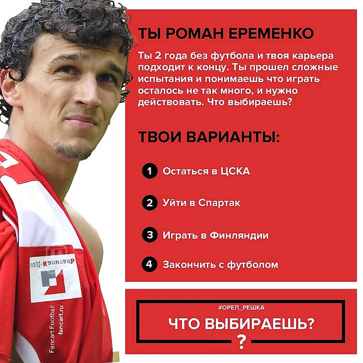 Ты Роман Еременко. Ты 2 года без футбола и твоя карьера подходит к концу. Ты прошел сложные испытания и понимаешь что играть осталось не так много, и нужно действовать. Что выбираешь?
