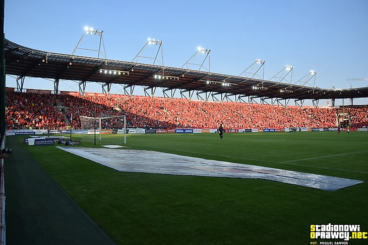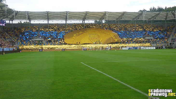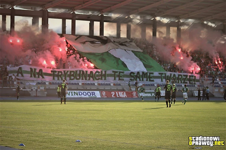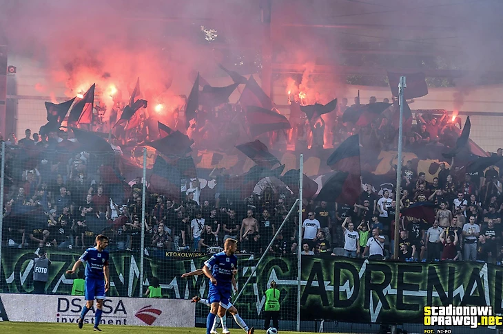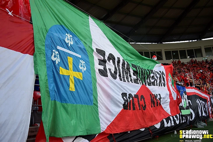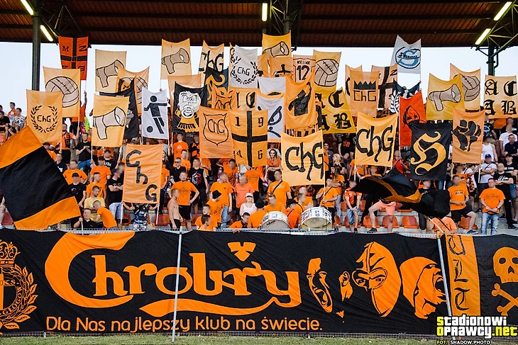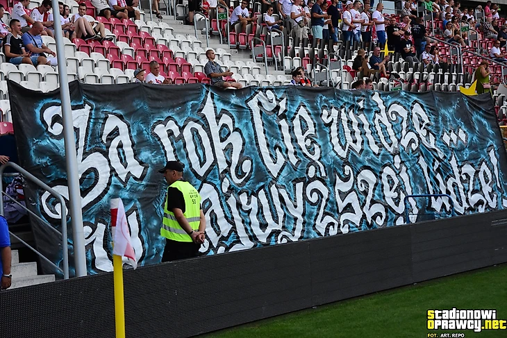 В первой лиге «Хробры» принимал гостей из Лодзи. Хозяева ярко оформили сектор, используя двуручники.