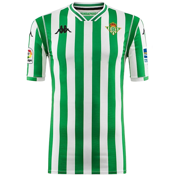 Узкие зеленые и белые полосы возвращаются на футболки «Бетиса». Они яркие и бросаются в глаза, в отличие от прошлогодних. Воротник аккуратно сочетается с остальными линиями.