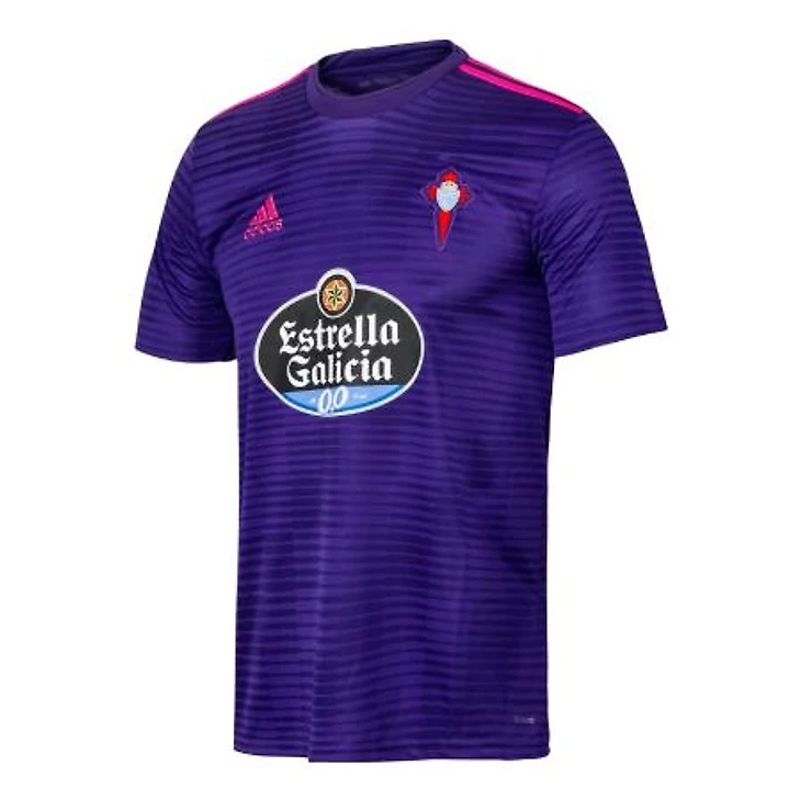 Фиолетовая футболка с различными текстурами; полосы и надпись Adidas розовые. Этот комплект с предысторией. В Виго находится икона «Соленый Христос». Её горожанам давным-давно подарил каталонский гость. Так здесь оказалась икона, принесшая победу над наполеоновской армией в 1809 году. Поэтому второе название образа – «Победоносный Христос». Каждый год в августе проходят празднования по случаю тех событий, а фиолетовый цвет – их неотъемлемая часть.