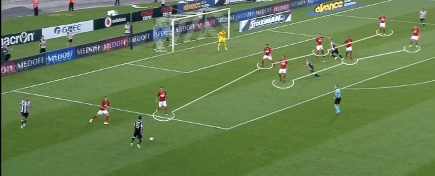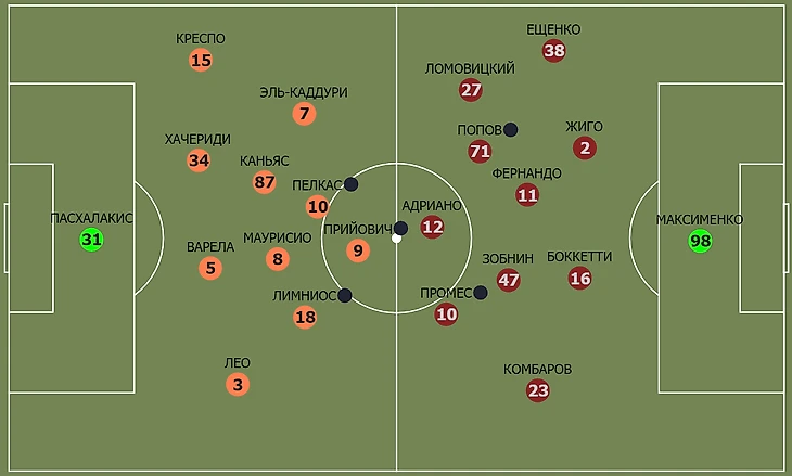 Результатом этих совпадений стало то, что при построении атак греками очень часто создавалась ситуация открытого мяча для центральных полузащитников и защитников и они с высокой частотой исполняли широкие диагонали направо (особенно Фернандо Варела – 4 точных длинных паса в игре, лидер команды). И в этой зоне «Спартак» был очень уязвим в ситуациях 1v1 против Лимниоса и Лео, и не только Комбаров – все, кто переключался на персоналку: Промес, Адриано, Зобнин.