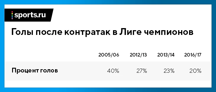 Логичным ответом на радикальное владение стало радикальное невладение – ситуация, при которой команда умышленно отдает мяч сопернику. Следствием стал огромный прогресс команд в позиционной обороне и значительное сокращение в уязвимости при переходе мяча от одной к другой. По мере распространения влияния «Барселоны» увеличивалась значимость эффективности команды в позиционном нападении. Неплохое олицетворение тренда: за последние 11 лет процент мячей, забиваемых в ЛЧ после контратак, сократился почти в два раза – в 2005/06 они составляли 40% от всех голов с игры, в последнем доступном отчете УЕФА за 2016/17 – лишь 20%. Более того, это часть тренда.