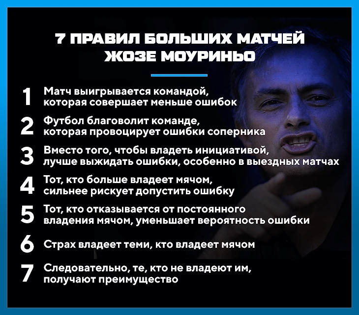 Особенно показательны слова о владении. Ранний Жозе не фетишизировал его, но точно понимал важность контроля. Это сильно отличается от знаменитых 7 правил больших матчей, которые он разработал в «Реале» и которых, судя по цифрам, придерживается до сих пор: