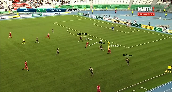 Обляков уводит за собой центр.полузащитника "Прогреса", пас на Игбуна проходит. Однако на Живоглядове нарушили правила, и судья развивающуюся атаку прервал. А мог и не свистеть...