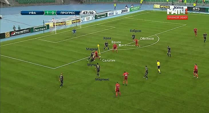 В этой атаке уфимцы хорошо разыграли мяч на фланге, а ключевым был как раз пас Салатича на Облякова, правда, удар Ивана был заблокирован