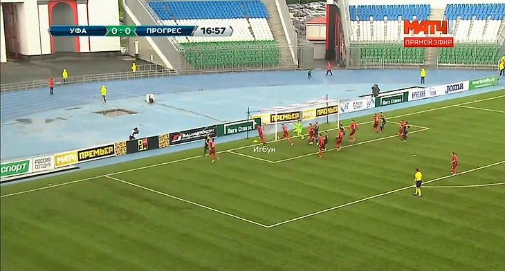 Игроки "Уфы" ввосьмером выстроились в линию. Посреди них три игрока "Прогреса", а ещё трое (Маркес, Карапетян, Мартинс) стоят неподалёку. Как только Тилль поднял руку, Маркес и Карапетян бегут на ближнюю штангу, Мартинс — на дальнюю, но останавливается в районе 11-метровой. Карапетян опережает Салатича и бьёт в створ. Беленов на месте