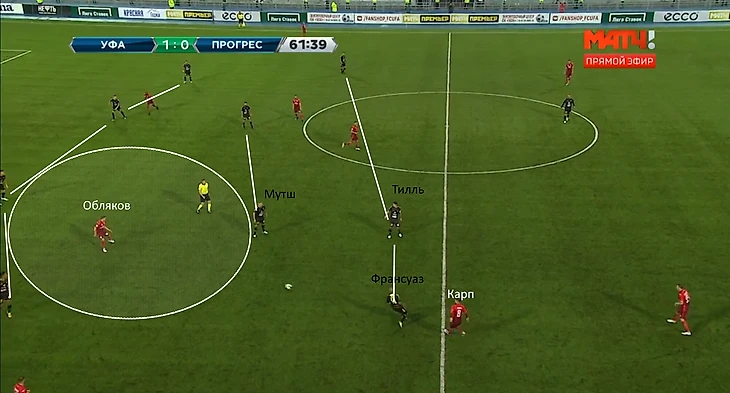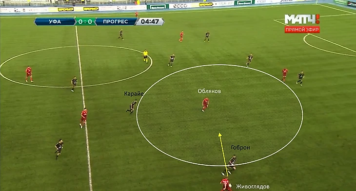 Но не стоит думать, что Обляков весь матч проделывал одно и то же действие — это не так. Он открывался как на правом, так и на левом фланге атаки, а после замены Ванека на Засеева (на 56-й минуте) вообще отправился на левый фланг на постоянной основе. Иногда Обляков хорошо открывался между линиями — это подтверждают как минимум два фото ещё из первого пункта этого материала. Но есть и ещё пример.