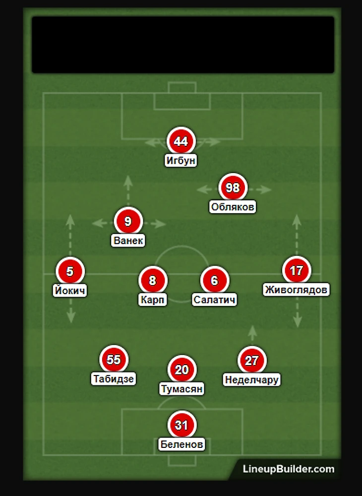 Салатич — под давлением сразу двоих, но делает пас вперёд. Он отрезал сразу всех игроков обороны и оказался точным — Обляков выскочил из-за спин защитников