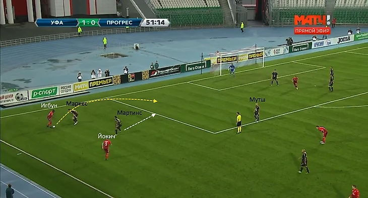Игбун обыгрывает Маркеса и бежит к воротам, итог — удар мимо ближнего угла. Но через 10 минут ещё одна успешная обводка будет предшествовать голевой передаче на Облякова