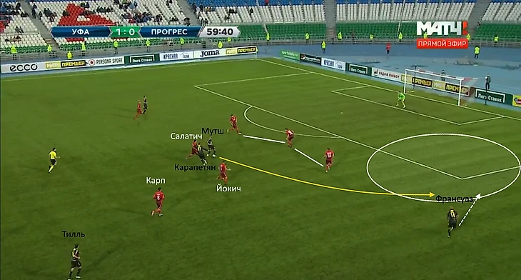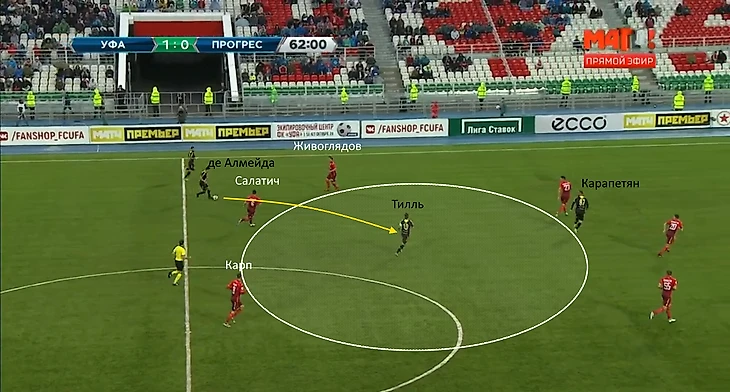 Несмотря на тот факт, что бóльшую часть матча в атаке были Йокич и Живоглядов, номинальные крайние защитники "Уфы", самые опасные контратаки "Прогреса" (да и вообще, почти все контратаки команды гостей) проходили именно через центр, и именно игроки центра поля (Салатич и Карп) раз за разом ошибались — в принятии решений, в выборе позиций в обороне. Они оба порой заигрывались в атаке: Салатич обострял, Карп играл в подыгрыше, и никто из них не оставался сзади, то есть они не учитывали местоположение друг друга и могли оба покинуть центр поля, через который после неточной передачи и шла контратака "Прогреса". Ситуацию усугубляла также жёлтая карточка, полученная Салатичем за фол против Тилля, который как раз и бежал (после неточной передачи того же Салатича) в свободную зону между линией защитников и полузащитников "Уфы".