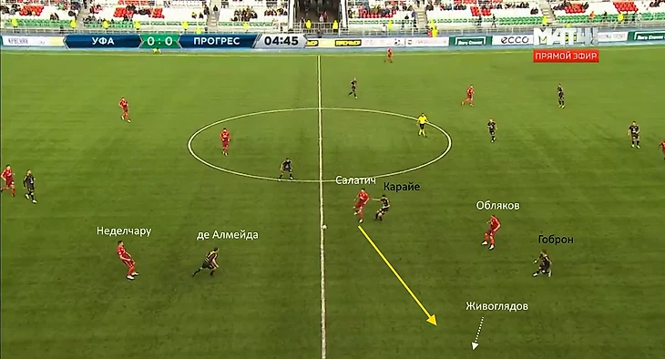 (Фото 1) Де Алмейда выбросился на Неделчару, но тот делает пас вперёд на Салатича, который, находясь под опекой центрального полузащитника "Прогреса", играет в одно касание на Живоглядова, а он (фото 2) — на Облякова, который открывается уже в свободной зоне